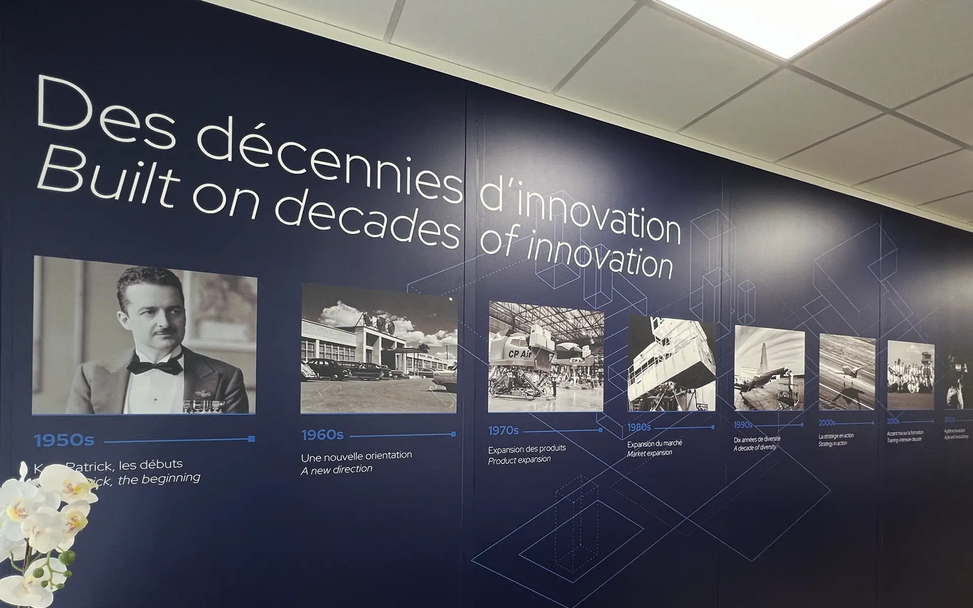 Un des axes forts du projet : une frise historique placée dans les couloirs, retraçant les jalons fondateurs de l’entreprise. Elle porte un message clair : l’exigence, la vision et l’innovation traversent les générations. Le choix d’images techniques (simulateurs, cockpits, exercices) a été scruté avec soin pour faire ressortir la technicité des formations dispensées.
